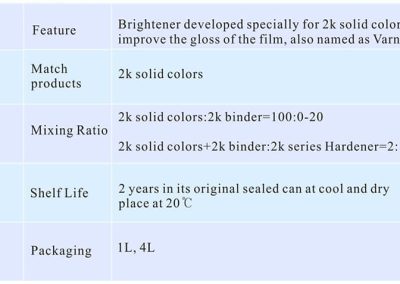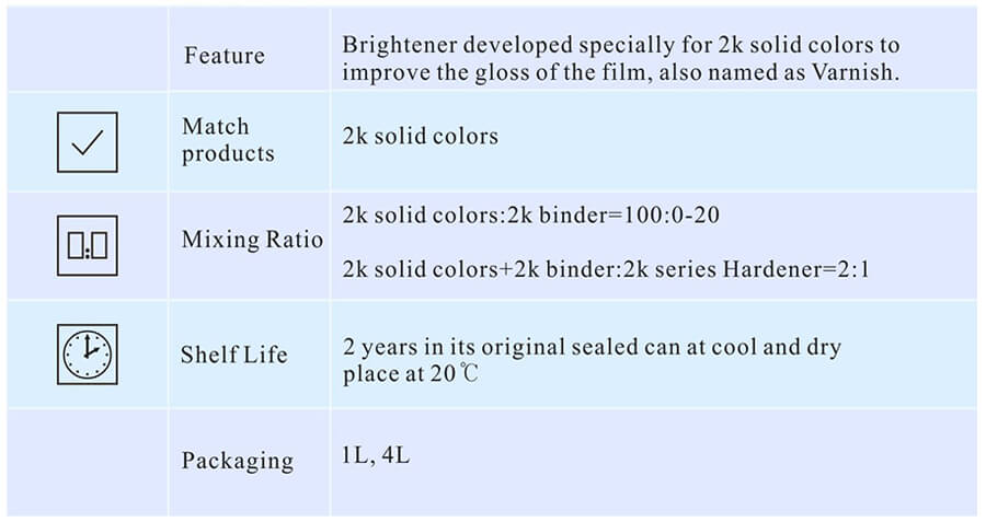 Brightener developed specially for 2K solid colors to improve the gloss of the film, also named as Varnish.