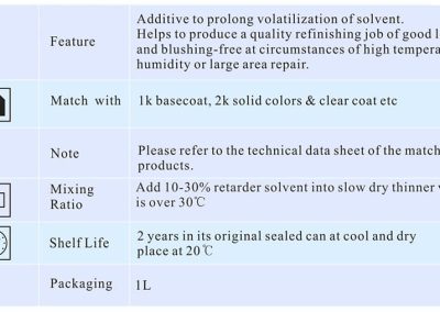 Aditivo para prolongar la volatilización del solvente. Ayuda a producir un trabajo de acabado de calidad con buena nivelación y sin rubor en circunstancias de alta temperatura, humedad o reparación de áreas extensas.