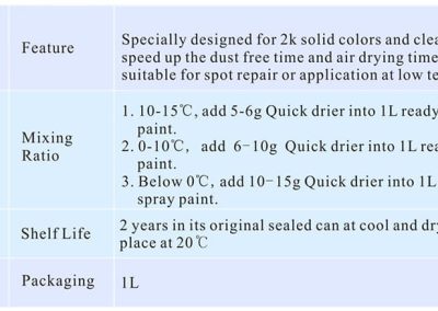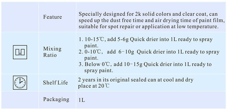 Especialmente diseñado para colores sólidos de 2k y capa transparente, puede acelerar el tiempo libre de polvo y el tiempo de secado al aire de la película de pintura, adecuado para reparación puntual o aplicación a baja temperatura.