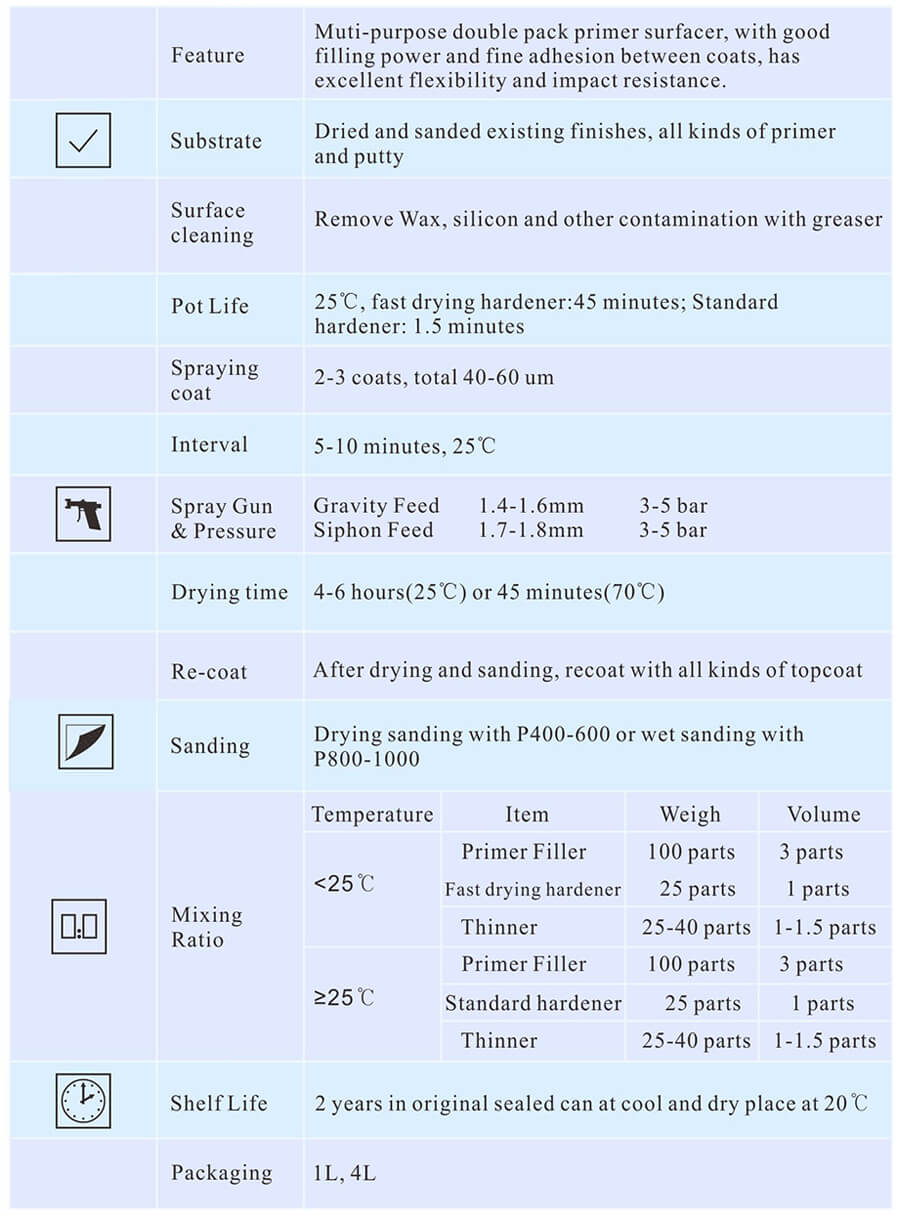 Muti-purpose double pack primer surfacer, with good filling power and fine adhesion between coats, has excellent flexibility and impact resistance.