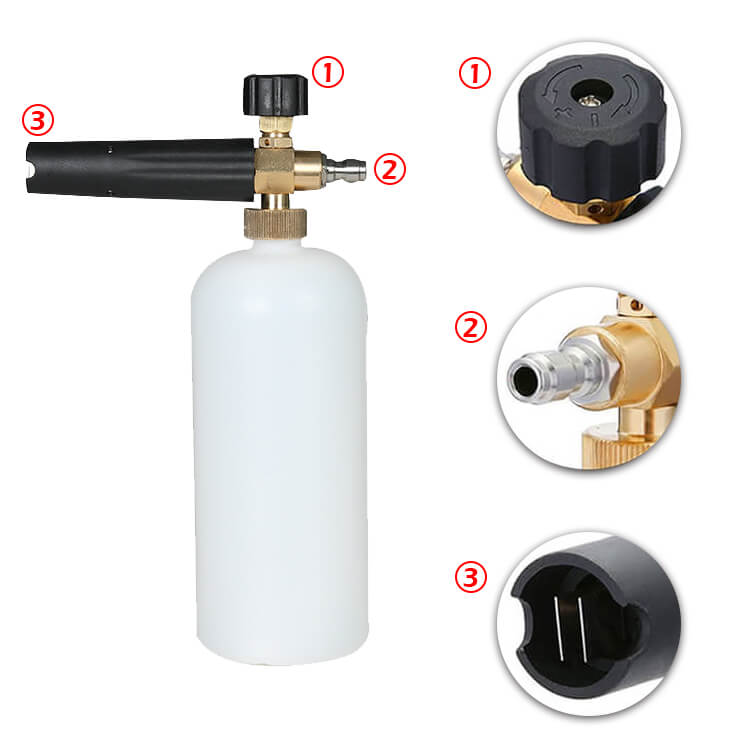 2. El cañón de espuma puede proporcionar un nivel de espuma ajustable y un ángulo de pulverización. Simplemente gire la perilla superior para obtener una espuma más espesa. Ajuste la boquilla para amplificar el ángulo de pulverización. Perfecto para lavar la casa, el automóvil, la pared, la motocicleta, etc.