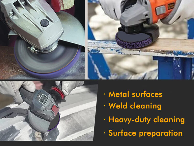 3. Haute compatibilité - Le disque de décapage pour meuleuse d'angle est conçu pour les meuleuses d'angle et peut être monté facilement. Il suffit de le fixer à votre meuleuse d'angle pour éliminer la rouille, l'oxydation ou nettoyer les cordons de soudure. Ces disques de décapage sont extrêmement polyvalents et spécialement conçus pour un décapage rapide avec une perte minimale de matière.