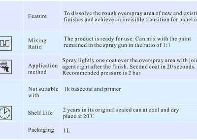 | Fonctionnalité | Pour dissoudre la zone de surpulvérisation rugueuse des finitions nouvelles et existantes et réaliser une transition invisible pour la réparation des panneaux. |