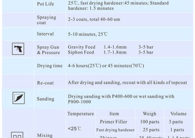 | Fonctionnalité | Apprêt surfaçant double-composant polyvalent, avec un bon pouvoir garnissant et une fine adhérence entre les couches, présente une excellente flexibilité et résistance aux chocs. |