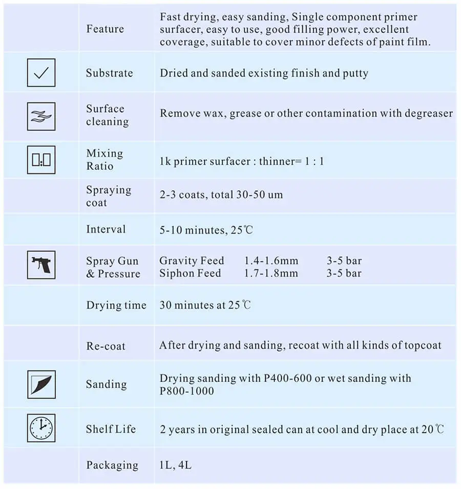 | Fonctionnalité | Séchage rapide, ponçage facile, apprêt surfaçant monocomposant, facile à utiliser, bon pouvoir garnissant, excellent pouvoir couvrant, adapté pour couvrir les défauts mineurs du film de peinture. |