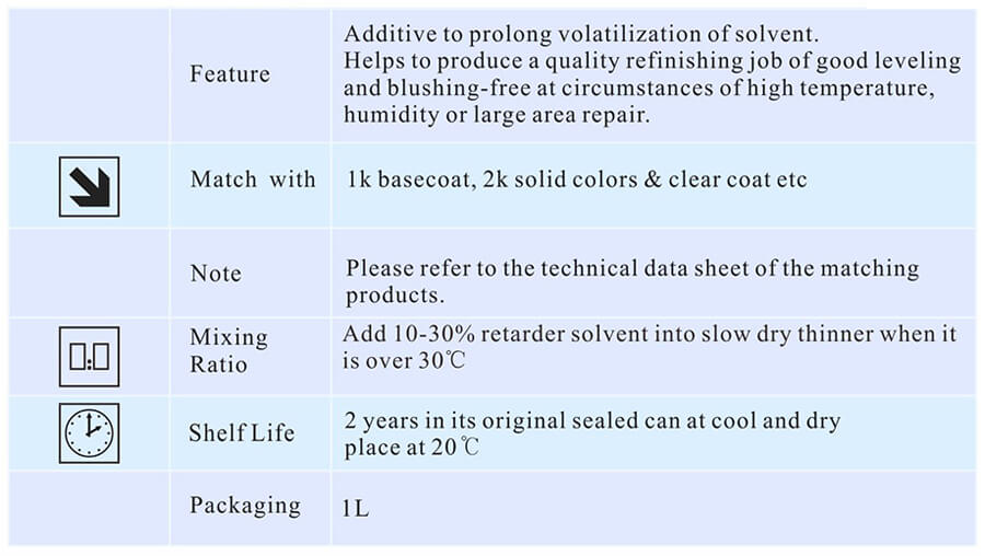 Добавка для продления испарения растворителя. Помогает произвести качественную ремонтную работу с хорошим выравниванием и отсутствием белесоватости в условиях высокой температуры, влажности или ремонта больших площадей.