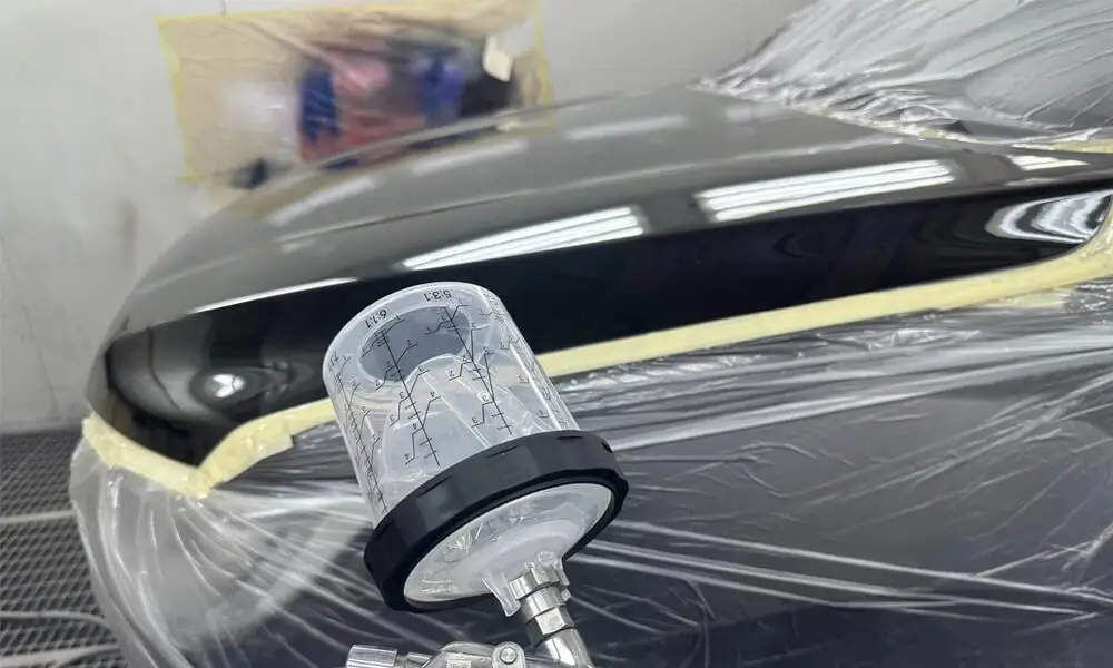 قبل وضع طلاء السيارة الشفاف على السطح بأكمله، قم بإجراء اختبار رش على منطقة صغيرة غير واضحة لتقييم تدفق الطبقة الشفافة وتطايرها وتغطيتها. اضبط إعدادات مسدس الرش، مثل ضغط الهواء وتدفق السوائل، حسب الحاجة. حافظ على مسافة ثابتة من 6 إلى 8 بوصات من السطح ثم ضع الطبقة الشفافة بتمريرات ناعمة ومتساوية، مع تداخل كل تمريرة بنسبة 50%.